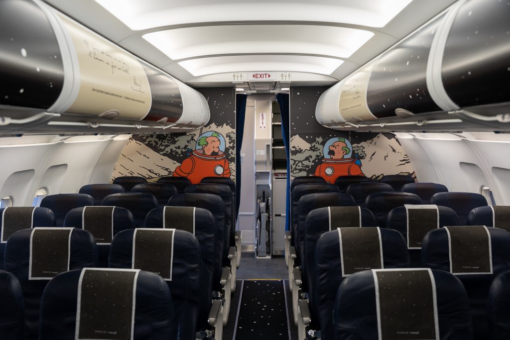 Indenfor møder passagerer også både Terry og Tintin samt Dupont og Dupond på kabinevæggene, og kabinens digitalt trykte gulvtæppe skal også give mindelser om himmelrummet.